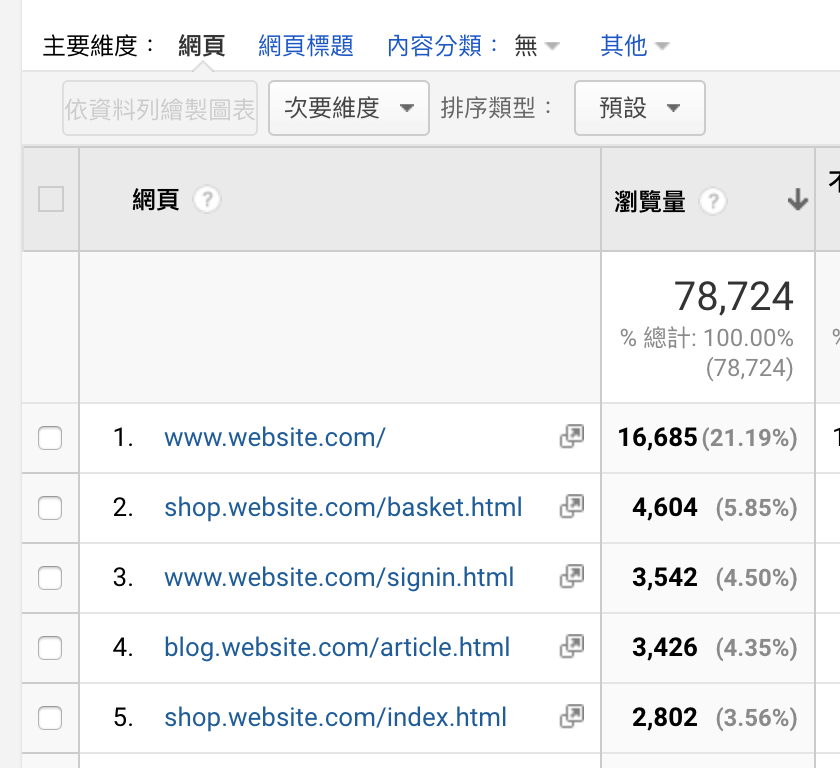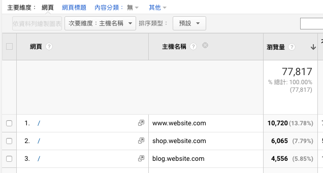 「網頁」中的 "/" 是 www.website.com、shop.website.com、blog.website.com 的混合數據,無法區分開各網域的數據。