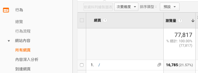 如下圖,進入 Google Analytics 最常看的報表之一 :「行為」→「網站內容」→「所有網頁」,這時就會發生一個常見的問題。