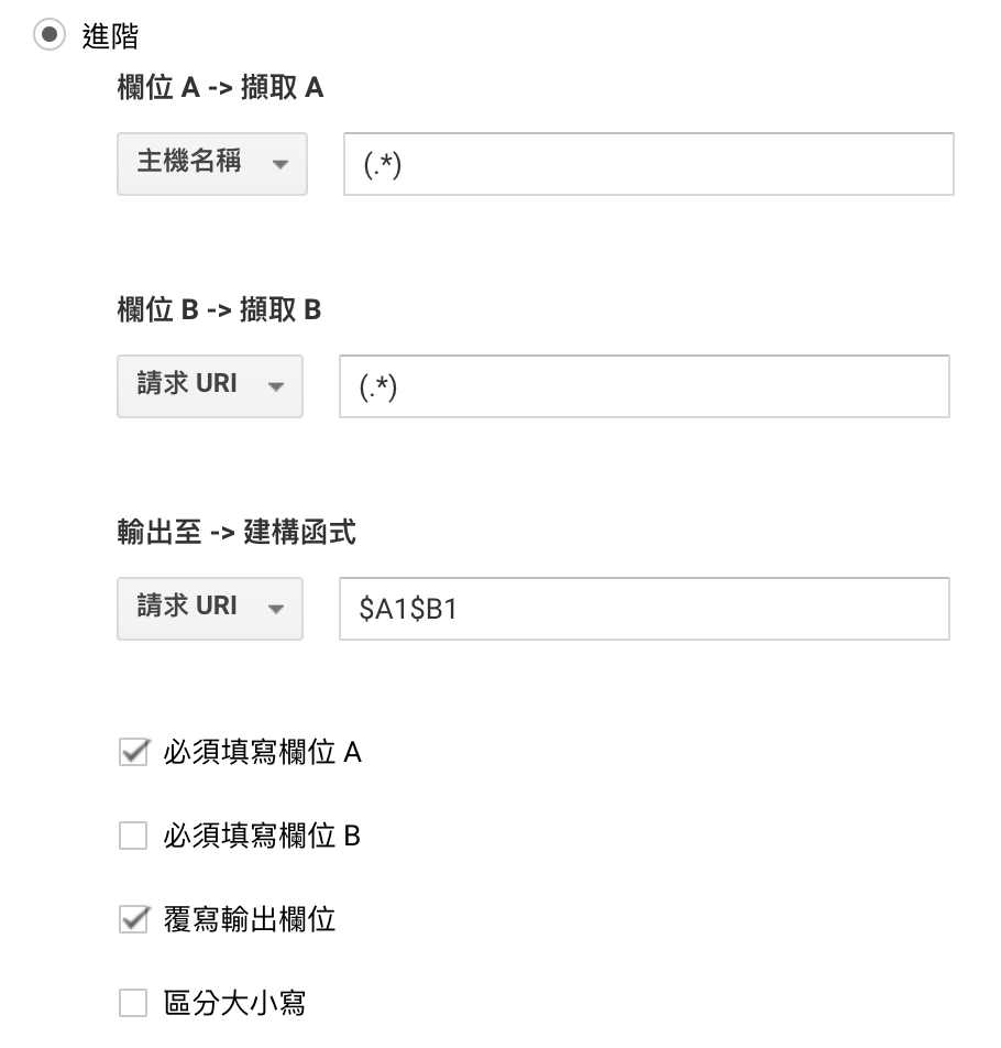 「欄位 B -> 擷取 B」,選「請求 URI」,設定內容填入「(.*)」