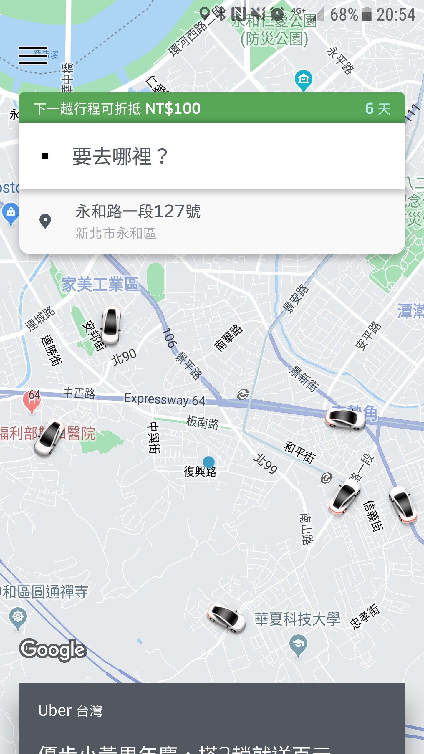 當我有了可以使用的優惠券後,只要在優惠券的有效期間,打開 Uber App 的第一畫面都會看到提醒字樣。