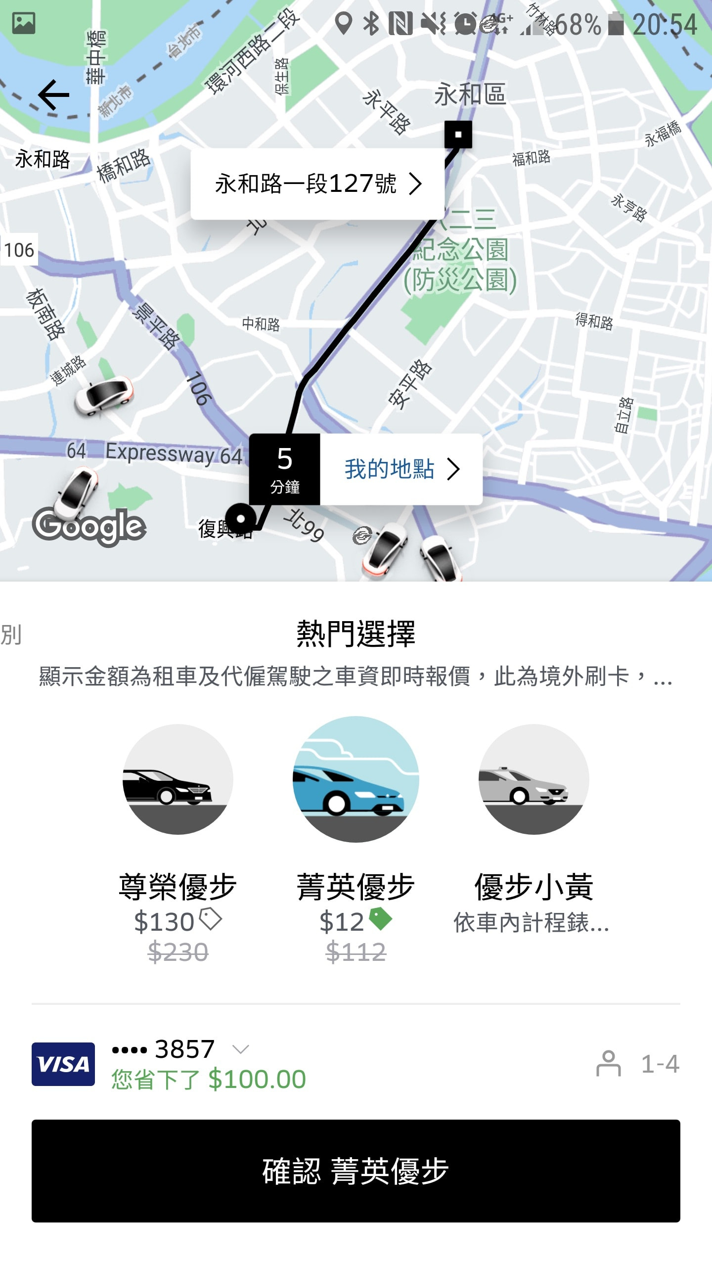 當我挑選好地點後,原本顯示價錢的地方變了,顯示的價錢不是原價,是折扣後的價錢,讓你很明確知道這趟搭車是有折抵的。刷卡處也顯示「您省下了$100」。